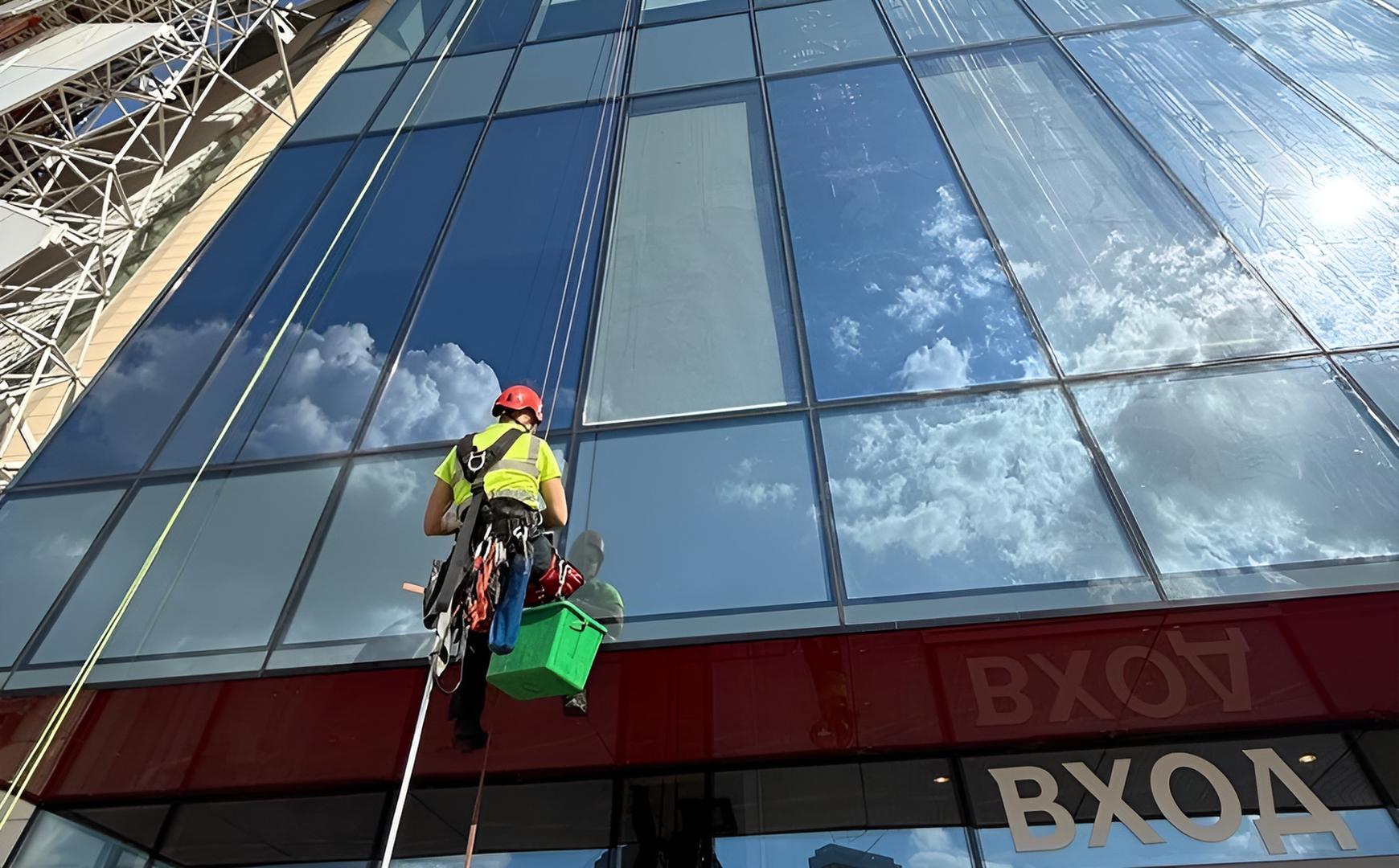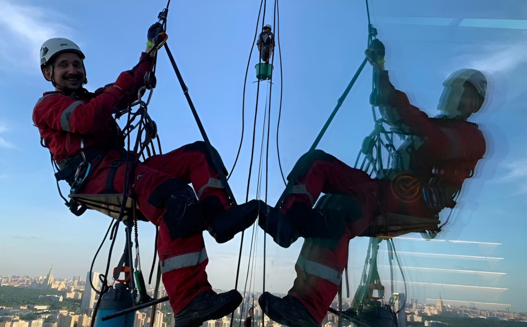 - Доступ к любой точке: Фасады со сложной геометрией, такие как в «Москва-Сити» или современных БЦ Подмосковья, доступны только для верхолазов.